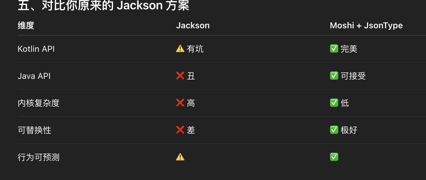 Jackson 的优势在“应用层”,Moshi 的优势在“框架内核层”。